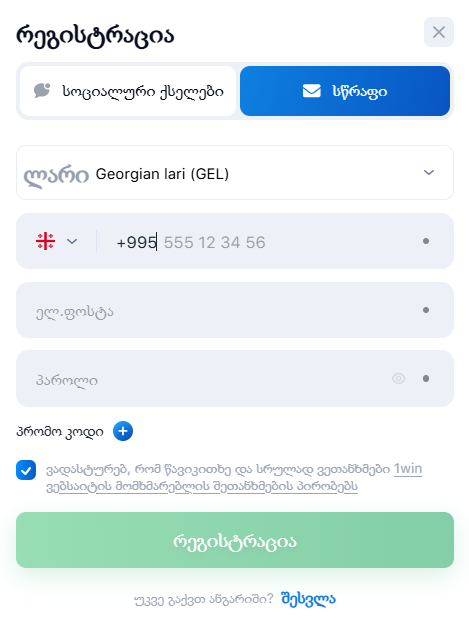 ყველაზე სწრაფი და მოსახერხებელი შექმნათ ანგარიში1win საქართველოში სრულდება რამდენიმე დაწკაპუნებით. 18 წელზე მეტი ასაკის მოთამაშეებს სთხოვენ დაასრულონ ანგარიშის შექმნის პროცესი სოციალური ქსელების დაკავშირებით. ერთ-ერთი რესურსის ხატულაზე დაწკაპუნებით, უბრალოდ მიჰყევით ინსტრუქციას და შედით თქვენი პირადი ანგარიშის მეშვეობით. ალტერნატიული გამოსავალი არის კლასიკური რეგისტრაცია. ამისათვის თქვენ უნდა შეავსოთ მოკლე ფორმა: